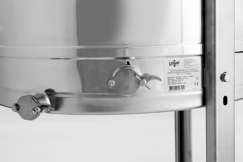 The 4 frame self-turning honey extractor is powered by an electric motor 180W / 230V with full electronic speed control and with a safety switch which stops the motor, if the lid of the extractor is opened. Modern technology enables the innovative manufacturing of the bottom of the extractor. The bottom of the drum is welded without inner edges and is inclined towards the outlet. A welded stainless drainage tap is built in at the lowest point so all the honey can drain out of the extractor. All parts of a honey extractor which come in contact with honey are made of materials appropriate for managing foods. The lid is made of transparent acrylic glass.