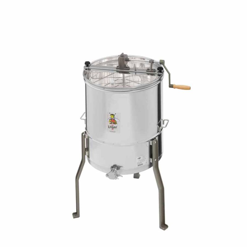 The 4 frames manual honey extractor with one-way hand drive with a brake. Modern technology enables the innovative manufacturing of the bottom of the extractor. The bottom of the extractor is welded without any inner edges and is inclined towards the tap. A welded stainless tap is built in at the lowest point so all the honey can drain out of the extractor. Cleaning the extractor is simple. All parts of a honey extractor which come in contact with honey are made of materials appropriate for managing foods. The lid is made of transparent acrylic glass. The special construction of the legs ensures that the extractor is stable.