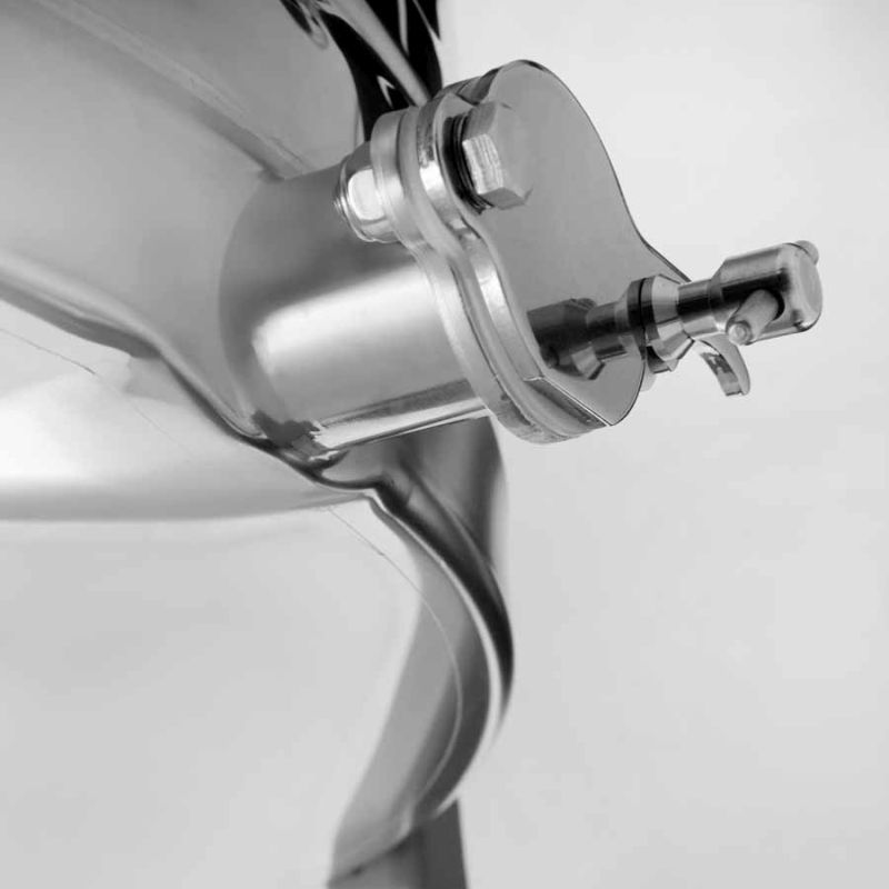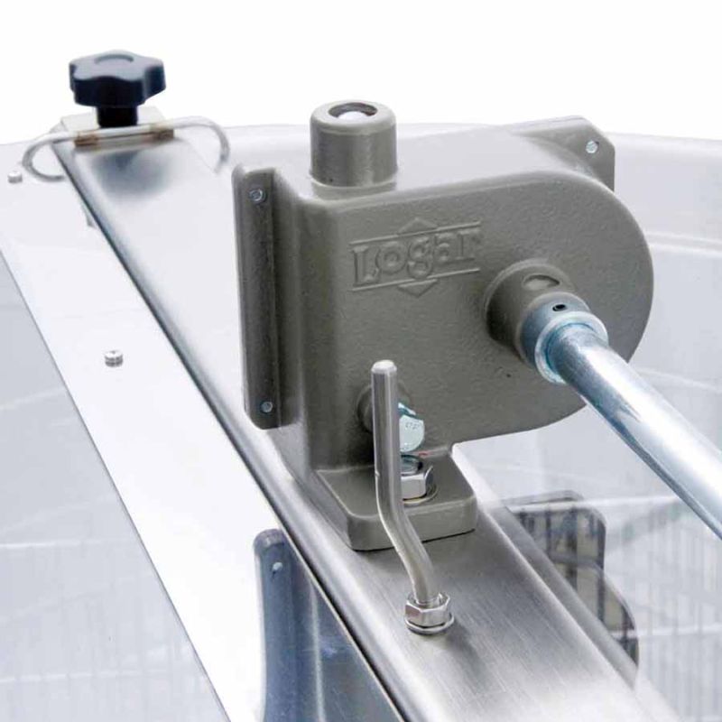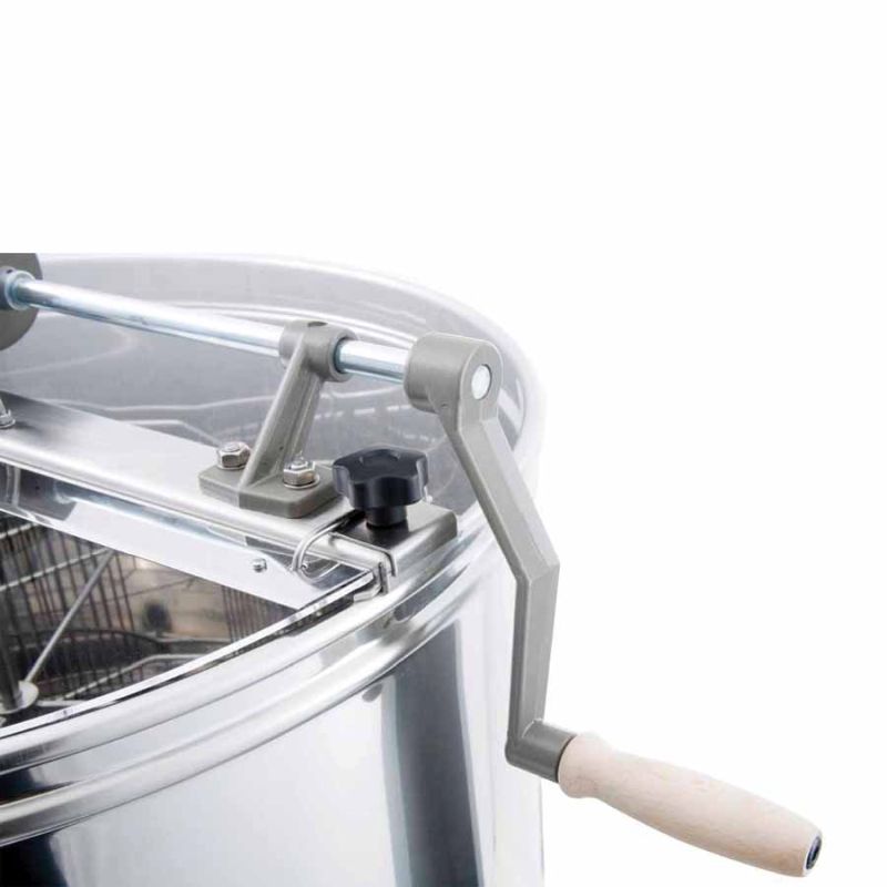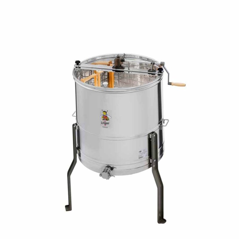 The 4 frames honey extractor, universal, manual one-way hand drive with a brake. Modern technology enables the innovative manufacturing of the bottom of the extractor. The bottom of the extractor is welded without any inner edges and is inclined towards the tap. A welded stainless tap is built in at the lowest point so all the honey can drain out of the extractor. Cleaning the extractor is simple. All parts of a honey extractor which come in contact with honey are made of materials appropriate for managing foods. The lid is made of transparent acrylic glass. The special construction of the legs ensures that the extractor is stable.