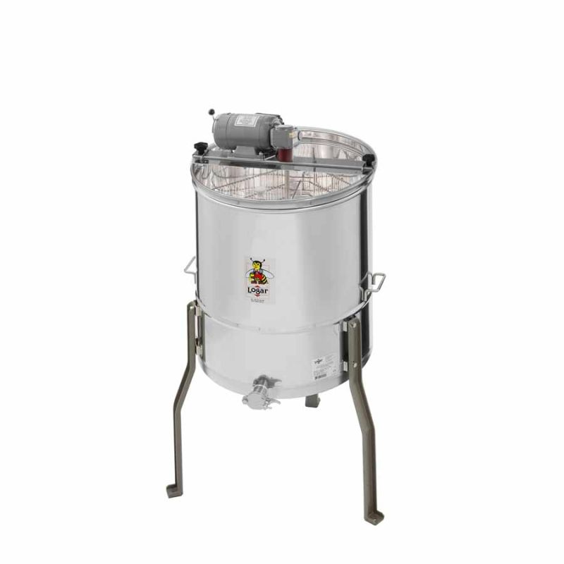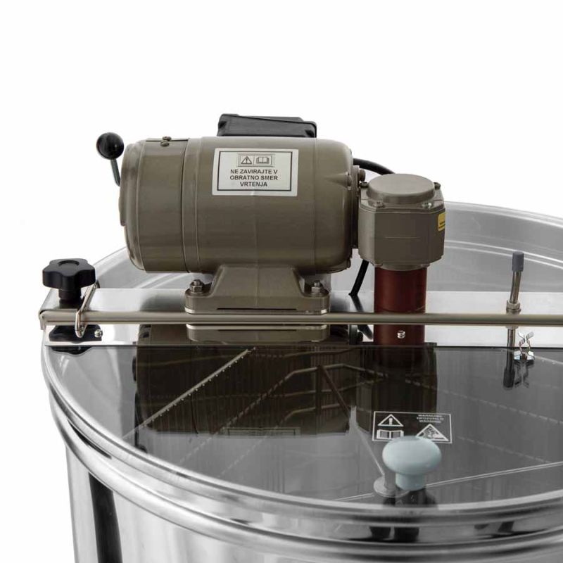 The 4 frames honey extractor is powered by an electric motor 110W / 230V with a safety switch which stops the motor if the lid of the extractor is opened. Modern technology enables the innovative manufacturing of the bottom of the extractor. The bottom of the extractor is welded without any inner edges and is inclined towards the tap. A welded stainless tap is built in at the lowest point so all the honey can drain out of the extractor. Cleaning the extractor is simple. All parts of a honey extractor which come in contact with honey are made of materials appropriate for managing foods. The lid is made of transparent acrylic glass. The special construction of the legs ensures that the extractor is stable.